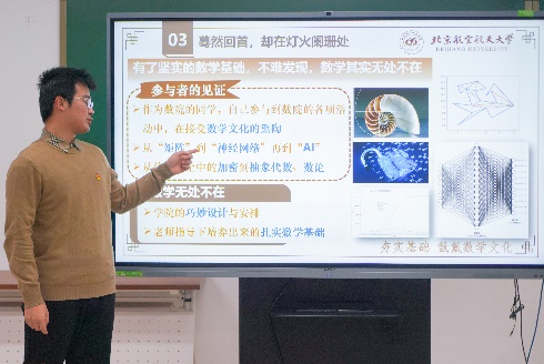周星汝、王浩然、徐晓东、王菲帆等四名同学进行分享。周星汝以“赓续大师精神 砥砺奋斗青春”为题,回顾了“人民数学家”华罗庚先生的人生历程,领略了华老爱国精神、自强精神、人梯精神和奉献精神。王浩然以“空天报国 勇担强基使命”为题,结合具体实例分享了自己所认识的数学美、数学趣;徐晓东以“夯实基础 氤氲数学文化”为题,分享了自己对于数学文化的认识;王菲帆以“科技报国 致用应用前沿”为题,结合自身大创科研经历,表达了学以致用的决心。